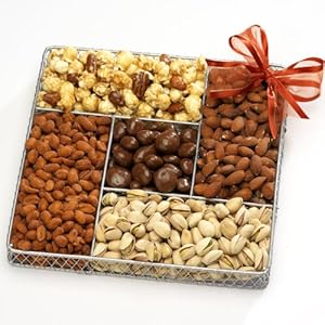 Express your holiday wishes and satisfy the taste buds of friends, family, clients, and associates by sending a Gourmet Nut Gift Tray from Broadway Basketeers. Divided into five generous compartments, this decorative tray is artfully arranged by hand, with mounds of sweet and savory snacks. The arrangement comes with an optional personalized gift card and is tied up with a festive bow.