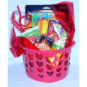 Why is this called a "Sneaky" Boy Basket? I have 4 teenage boys and this basket has everything they keep sneaking away to play with or eat! It's not just the boys- their girlfriends take it all too! The heart-shaped basket contains a turbo plane launcher, a 3 foot long Twizzler candy rope, M;M candies, red hots, Pop Rocks candy, candy conversation heart and fruit snacks. Everything is wrapped in cello and tied with ribbons. We can add a message from you and send it right to your favorite Valentine!